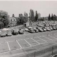 Vanuit een ladderwagen gezicht op de bouwlokatie Varkenmarkt (Nieuwe Markt). 07-04-1986Gezicht op de parkeerplaats met rechts de Blekerssingel. -