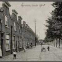 De Boelekade aan weerszijden met de halsgevelhuisjes links. ca. 1918, - Afbeelding De Boelekade aan weerszijden na de herbestrating, genomen vanaf de Karnemelksloot.