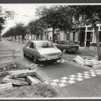 IJssellaan, auto rijdt tussen twee opgebroken openbare plantenbakken door -