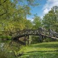 Opnamen van het Van Bergen IJzendoornpark. Een waterpartij met de takkenbrug. -