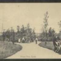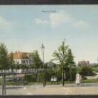 Van Bergen IJzendoornpark, op de achtergrond toren Kleiwegkerk, huizenrij -