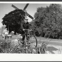 Nieuwe Veerstal, fietsers op de 'Molen en Fietsdag' langs molen 't Slot - Afbeelding Nieuwe Veerstal, gezien vanaf de Haastrechtse brug molen De Roode Leeuw, molen 't Slot en de Gouwekerktoren