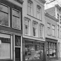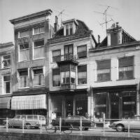 Gezicht op de Lage Gouwe 46 t/m 62 met de beide Visbanken en achter de St.-Janstoren. -