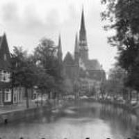 Gezicht op de St. Jozefkerk aan de Hoge Gouwe over het water met links de Lage Gouwe in de kromming. -