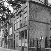 Gezicht op de Hoge Gouwe 201 t/m 209 gezien vanaf het Bolwerk, rechts gashouder. - Afbeelding Gezicht op de Hoge Gouwe ter hoogte van de Groenendaal met de Lutherse kerk rechts een brugwachtershuisje, op de achtergrond de St. Jozefkerk, 1930.