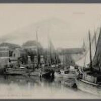 Gezicht op de Bogen met afgemeerde zeilvrachtschepen in de Turfsingel. c. 1903. -