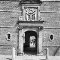 Ingang van het Willem Vroesenhuis aan de Spieringstraat. Voor de ingang een man die juist naar binnen gaat. -