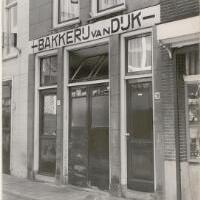 De panden in de Doelenstraat, 1964. De onderpui van bakkerij Van Dijk op Doelenstraat 20 en 22, 16 mei 1964 -