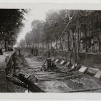 Herstellingswerkzaamheden aan de walmuren van de Oosthaven en Westhaven, uitgevoerd door A. Mooten te Moordrecht voor f. 37. 737,--, september 1930. Vlak voor de Minderbroedersbrug zuidwaarts. -