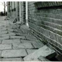 Gestutte huizen aan de Cronjéstraat als gevolg van een bodemverschuiving door de aanleg van de oprit naar de Goejanverwelledijk. Het verschoven trottoir en de weggedrukte onderkant van de huizen. - Afbeelding Nieuwbouw op de hoek Cronjéstraat / F.W. Reitzstraat, 1983.