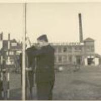 Foto's uit een album aangeboden aan de gemeente Gouda ter herinnering aan de streektentoonstelling Hart van Holland, gehouden van 19 t/m 28-6-1947 aan de Graaf Florisweg. De burgemeester hijst een vlag op het terrein bij de modelwasserij firma J.H. van Straaten -