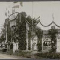 Verschillende situaties in het vluchtoord voor Belgische vluchtelingen in de 1e wereldoorlog aan de Graaf Florisweg. c. 1916. De ter gelegenheid van een huldeblijk van de vluchtelingen, versierde ingang van het vluchtoord (19-06-1916). -