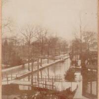 Vluchtelingenkamp Graaf Florisweg voor Belgische vluchtelingen uit de 1e wereldoorlog, ca. 1916. Zijaanzicht van een houten noodgebouw met in de deuropening enkele mensen. - Afbeelding Voetgangersbruggetje en rijbrug in Graaf Florisweg over de Breevaart, gezien in westelijke richting, 19-01-1982.