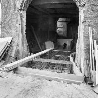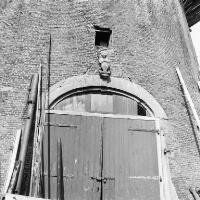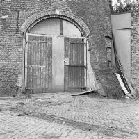 - Afbeelding Korte Vest, verpauperde zijde van het Kazernegebouw, met dichtgemetselde toegang en daarboven het specifieke ronde raam. Via een bord wordt er gewaarschuwd voor vallende dakpannen en is toegang verboden voor alle verkeer.