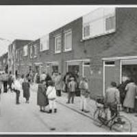 Snoystraat, oplevering nieuwbouw eengezinswoningen. Er zijn vlaggen en het is druk op straat. Mensen kijken door de ramen heen naar binnen.