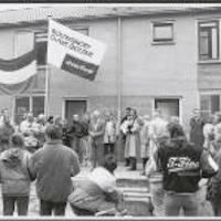 Prins Hendrikstraat, veel belangstelling voor de uitreiking van de laatste sleutel van de nieuwbouw eengezinswoningen op de voormalig Zenith-locatie. Met de Nederlandse vlag en de vlag van Bouwgroep Ouwe Gouwe. -