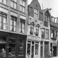 Het Steenhouwersgildehuis in de Naaierstraat 6 met daarin de fruitwinkel van A. v.d. Draaij. ca. 1914. -