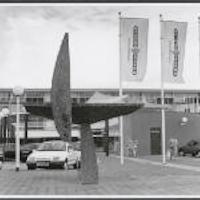 Goverwellesingel, kunstwerk en vlaggen op de parkeerplaats van Winkelcentrum Goverwelle -