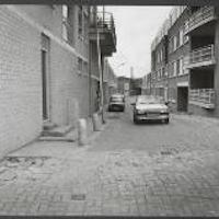 - Afbeelding Singelstraat, tussen oude panden en schuttingen ligt een groot braakliggend terrein. In de verte de Gouwekerktoren en molen 't Slot.