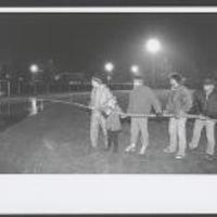Leden atletiekvereniging Gouda spuiten met waterslang de atletiekbaan in het Groenhovenpark op, ter verkrijging van ijsbaan