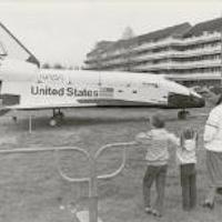 Model van de spaceshuttle Columbia staande op een veld in Bloemendaal, 11-5-1985.