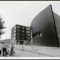 Middenmolenplein, buitenkant bibliotheek met bijzondere vorm, nog werkzaamheden aan het trottoir - Afbeelding Middenmolenplein, muziekvereniging De Pionier loopt al spelend uit winkelcentrum Goverwelle