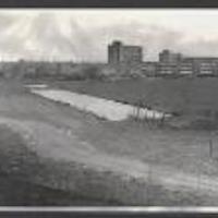 Scharroosingel, onverhard fietspad bij vijver. Flats en laagbouw op de achtergrond.