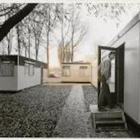 Noodgebouwen van de sociale werkplaats aan de Fluwelensingel, 11-11-1983. In de deuropening van het rechter gebouw gaat medewerker Frank van der Post juist naar binnen.