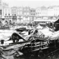 Een omgewaaide kermistent op de Markt achter het stadhuis, 1919. -