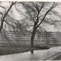 Bomen langs het water van de Voorwillenseweg met op de achtergrond de flats aan de Bleysstraat. - Afbeelding Bosweg, 1966. Bosweg 111 t/m einde.