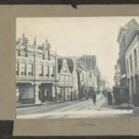 Opname van de toren van de St.-Janskerk gezien vanaf het begin van de Lage Gouwe. - Afbeelding Opnamen van de Schouwburg en sociëteit Ons Genoegen in gebouw Kunstmin aan de Boelekade. De Schouwburglaan gezien vanaf de Blekerssingel met op de achtergrond Ons Genoegen
