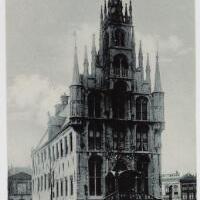 De voorgevel van het stadhuis op de Markt, opgenomen voor de vervaardiging van een ansichtkaart, ca. 1900. -