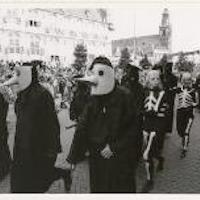 Feestelijke herdenking van Gouda 1272-1972. Optocht van de pestdragers over de Markt. - Afbeelding Feestelijke herdenking van Gouda 1272-1972. Optocht van kinderen over de Markt.