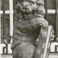 De standbeelden - leeuw met stadswapen - staande op de Veerstal nabij het Tolhuis, 1972 en 1974Close-up, 23-5-1972. - Afbeelding De standbeelden - leeuw met stadswapen - staande op de Veerstal nabij het Tolhuis, 1974.
