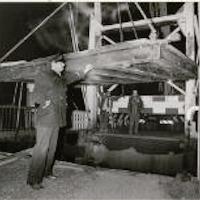 - Afbeelding Het overeindzetten van een omgetrokken koets van koetsier Ton van Duin - links met baard - op de Markt, 01-10-1982.