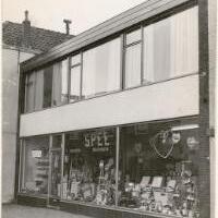 Opnamen van de Walestraat. De voorgevel van de winkel in electrische huishoudelijke apparaten van Spee op no. 8. publ. GC 07-03-1964. -