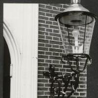 Oude lantaarn met koperen hoed aangebracht aan de gerestaureerde Remonstrantse kerk in de Keizerstraat, 9 oktober 1962. -