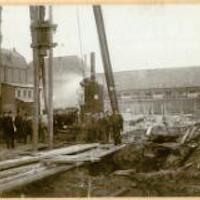 Autoriteiten bij het slaan van de eerste paal voor de bouw van de RK ULO school aan de Nieuwehaven 308. -