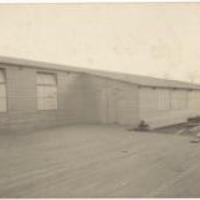 Het vluchtoord aan de Graaf Florisweg voor Belgische vluchtelingen uit de eerste wereldoorlog, ca. 1916. Het exterieur van de school van de H. Jozef in een barak. -