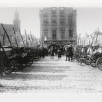 Diverse opnamen uit het boekje Gouda's Markets, Goudsche Markten. Hulp van het marktpersoneel bij het uitspannen van de wagens op de Markt. Op de achtergrond de zijgevel van het stadhuis. -