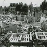 Het kunstwerk in aanbouw aan de buitengevel van de Garenspinnerij aan de Turfsingel, 1985. Met de ontwerper?