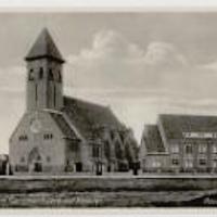 Voor- en zijaanzicht van de H. Sacramentskerk met pastorie in de Tollensstraat. ca. 1930. -
