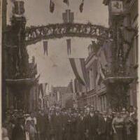 De viering van koninginnedag, ca. 1930. In hoofdzaak volwassenen onder een ereboog in de versierde Keizerstraat. -