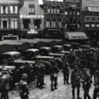 Duitse bezettingstroepen -compleet met muzikanten- aangevoerd door 6 vrachtauto's tijdens een pauze op de Markt. -