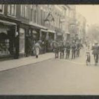 Lange Tiendeweg in oostelijke richting, soldaten op straat, links een boekhandel -