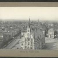 Markante plekken in gouda uit Gemeenteverslag, ca. 1925. Gezicht op Markt en stadhuis vanaf wrsch. de St. Janskerk. Op de achtergrond de Kleiwegkerk zonder toren. -
