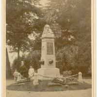Het monument voor de gebroeders De Houtman in het Houtmansplantsoen, met onderschrift: Aangeboden aan de Abonné's van de Goudsche Courant. -