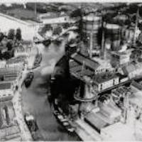 Luchtopname van de N.V. Goedewaagen aan het Jaagpad hoek Nieuwe Vaart, ca. 1935. -