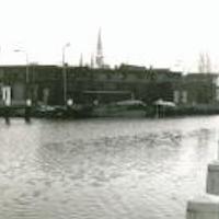 Het complex van het voormalige Gemeentelijk Energiebedrijf aan het Nonnenwater. Het gebouwencomplex aan de kant van de Gouwe: links nu kantoor waterleiding, daarnaast een vleeshouwerij, daarnaast een gedeelte van de GLF (Gemeentelijke Lichtfabrieken). -