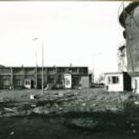 Het complex van het voormalige Gemeentelijk Energiebedrijf aan het Nonnenwater. 1,5 gashouder gezien vanaf het bedrijfsterrein zelf. -